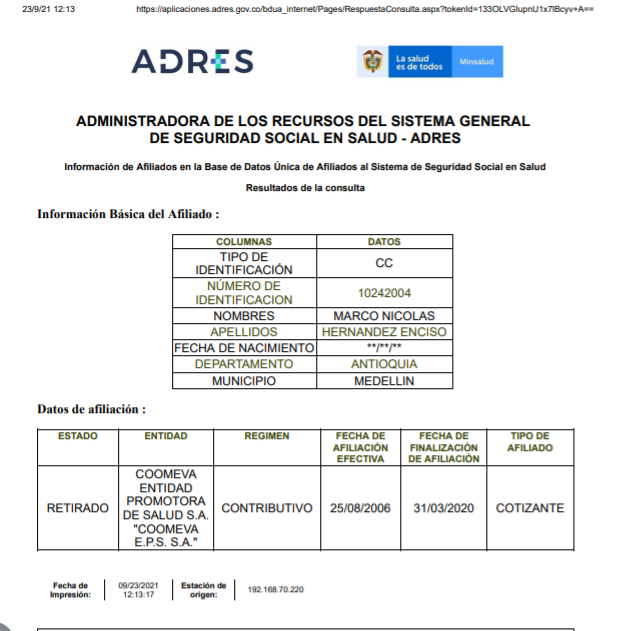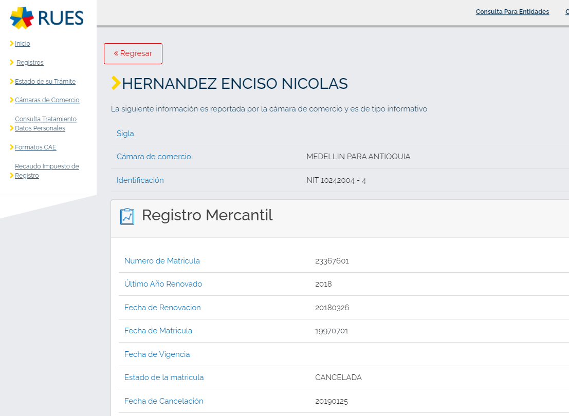 Paralelamente se inicia la investigación patrimonial del deudor y se desprende que la matricula mercantil fue cancelada en el año 2018, lo cual indica que se encuentra comercialmente inactivo, no posee bienes inmuebles a su nombre y adicionalmente se encuentra retirado de la EPS lo que indica que no posee un salario embargable al no figurar cotizante.